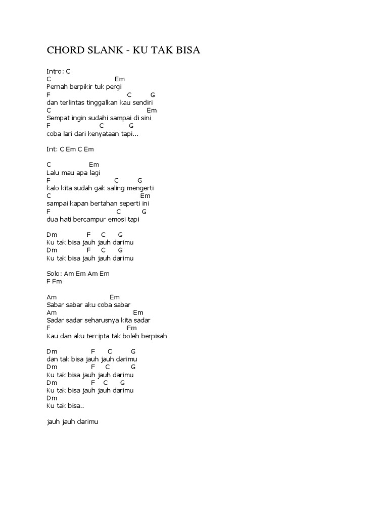 Lirik dan Chord Lagu Ku Tak Bisa - Slank. Free printable and easy chords for song by Moza - Medley Lagu Galau. C C Em Pernah berpikir tuk pergi F C G Dan terlintas tinggalkan kau sendiri C Em Sempat ingin sudahi sampai di sini F C Coba lari dari kenyataan G Dm F C G Tapi ku tak bisa jauh jauh darimu Dm F C G Ku tak bisa jauh jauh darimu Int.