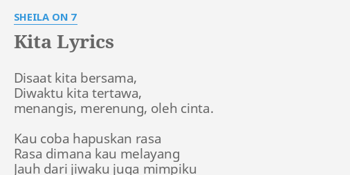 Berikut Lirik Lagu Kita Sheila on 7 Lengkap. Terbayang disaat kita bersama C Disaat penuh cinta D Canda dan tawa G Bm Tak mngkin mudah untk ku lupa C Masa masa yang indah D Suatu kita bersama G Bm Akankah mungkin terjadi lagi C Masa masa bahagia D Yang kita lewati bersama G. Disaat Kita Bersama Diwaktu Kita TertawaMenangis Merenung oleh Cinta Berikut Chord Kita dari Sheila On 7 Disaat kita bersama Diwaktu kita tertawa menangis.